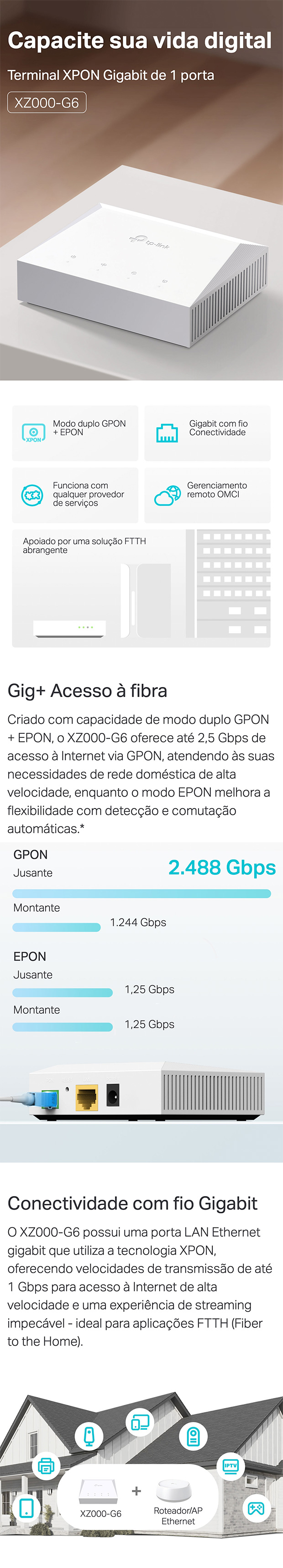 Suporta velocidades de até 2.488 Gbps downstream e 1.244 Gbps upstream, em conformidade com a norma ITU-T G.984 (Classe B+).