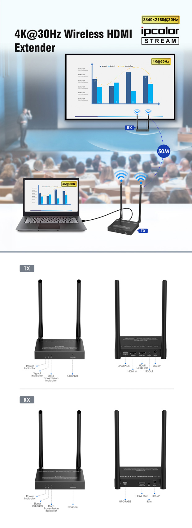 Este é um extensor sem fio HDMI 4K@30Hz, incluindo um transmissor e um receptor. A adoção da tecnologia ipcolor STREAM pode realizar transmissão de alta definição e baixa latência. Baseado na banda de frequência sem fio 5G, com desempenho anti-interferência e segurança estável. Ele suporta transmissão sem fio 1 para 1 e a distância de transmissão pode chegar a 50 metros, resolvendo efetivamente problemas causados por fiação complicada. É uma solução de transmissão de vídeo sem fio ideal para videoconferências, entretenimento doméstico, educação multimídia, etc.