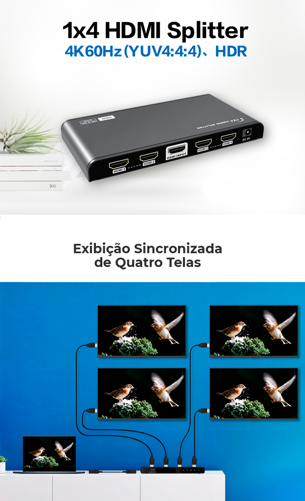 4Kx2K @60Hz HDMI 2.0 3D 1*4 HDMI Splitter com gerenciamento EDID e auto-downscaling