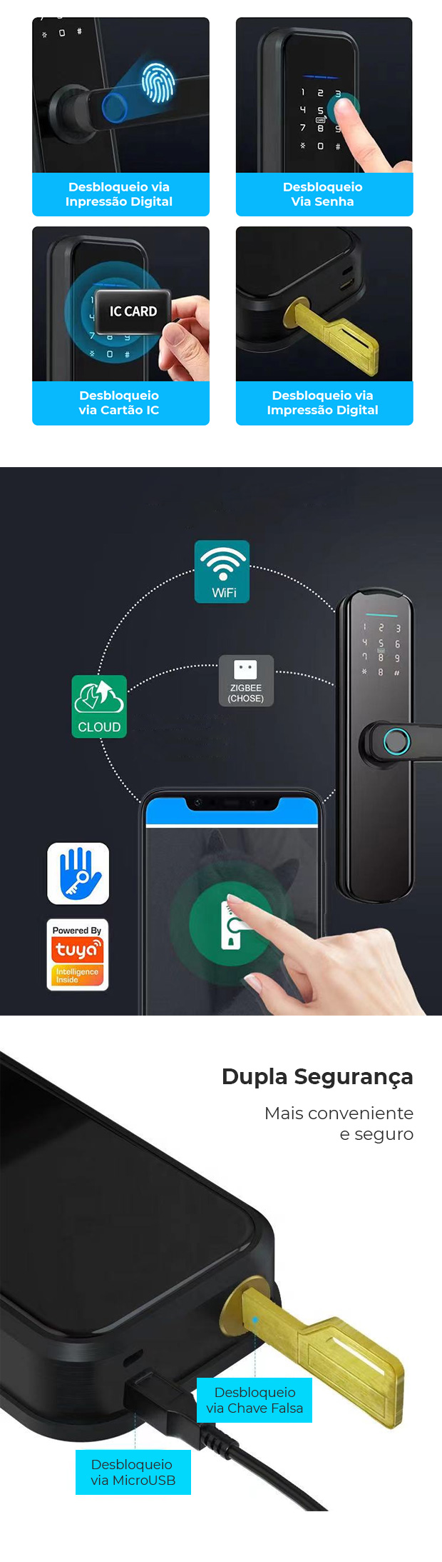 Modo de desbloqueio: Aplicativo TUYA e senha Impressão digital e cartão e chave e porta USB