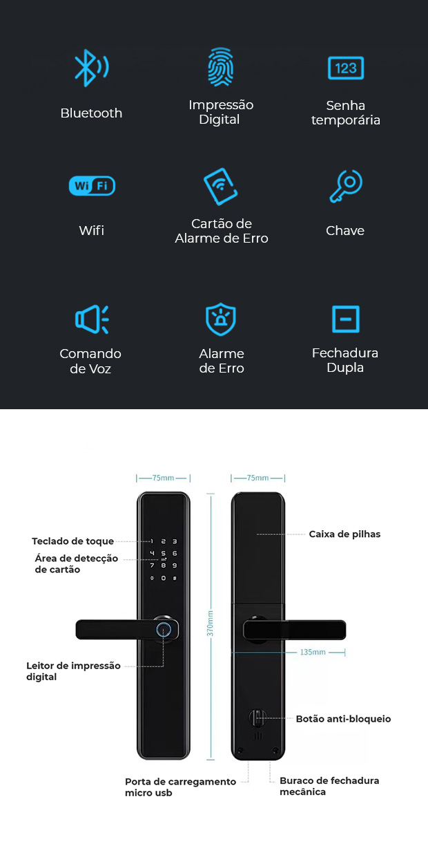 • WiFi/USB/Chave/Cartão desbloqueio/Impressão Digital/Senha