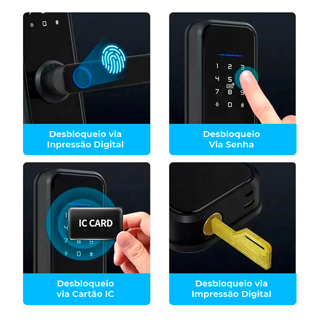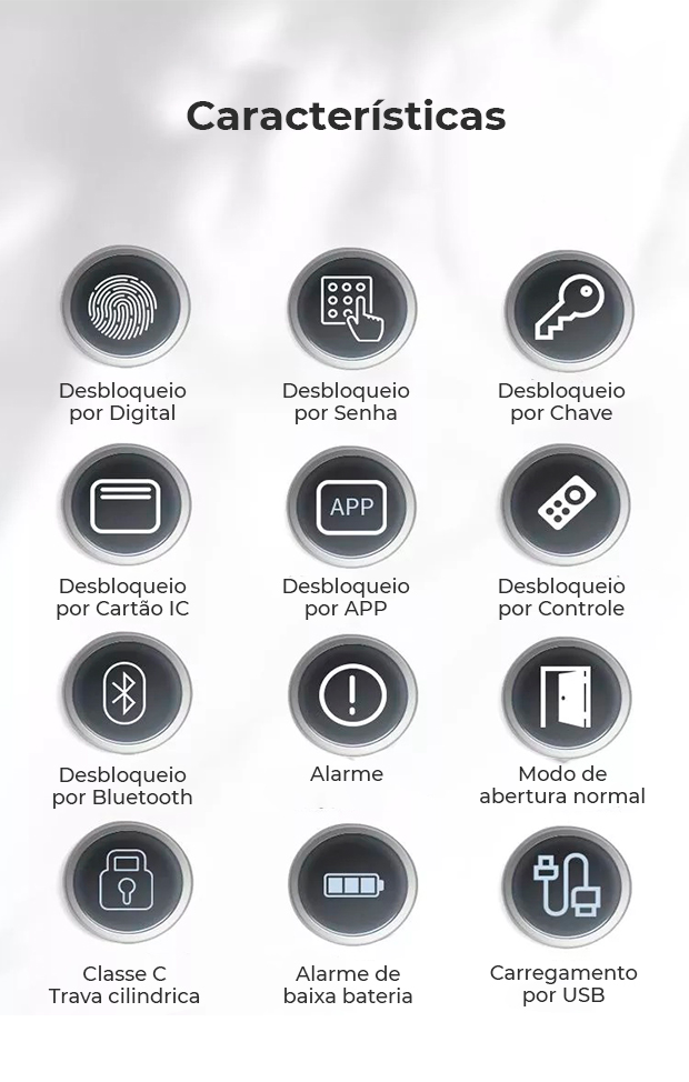 - Desbloqueio: Bloqueio: app TTlock BlueTooth , senha, impressão digital, cartão e chave e porta USB