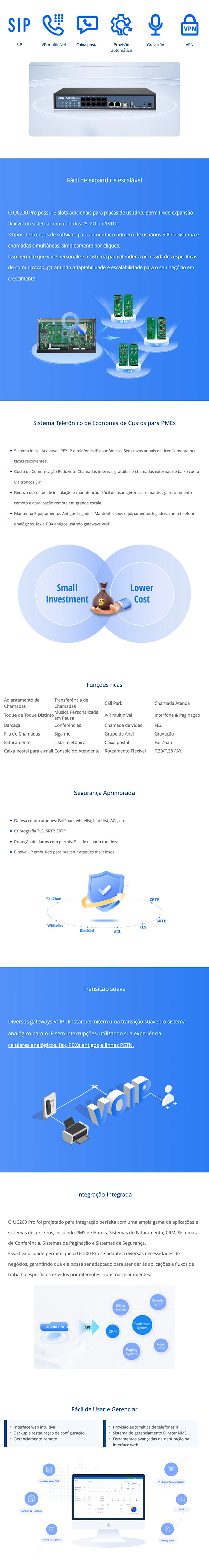 - Gerenciamento: Interface web intuitiva, provisionamento automático de telefones IP e sistema de gerenciamento centralizado Dinstar NMS.