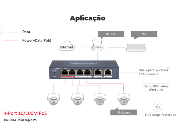 - 4 portas PoE 10/100Mbps e 2 portas RJ45 10/100Mbps.