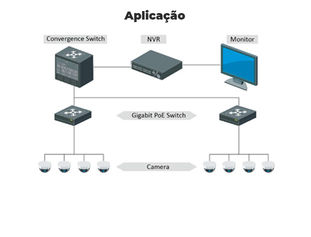 - 8 portas PoE gigabit, 1 porta RJ45 gigabit e 1 porta de fibra óptica SFP gigabit.