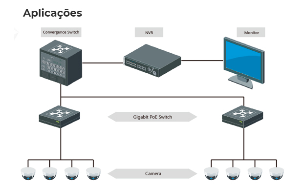 - Portas: 24 × portas Gigabit PoE e 2 × portas de fibra óptica Gigabit.