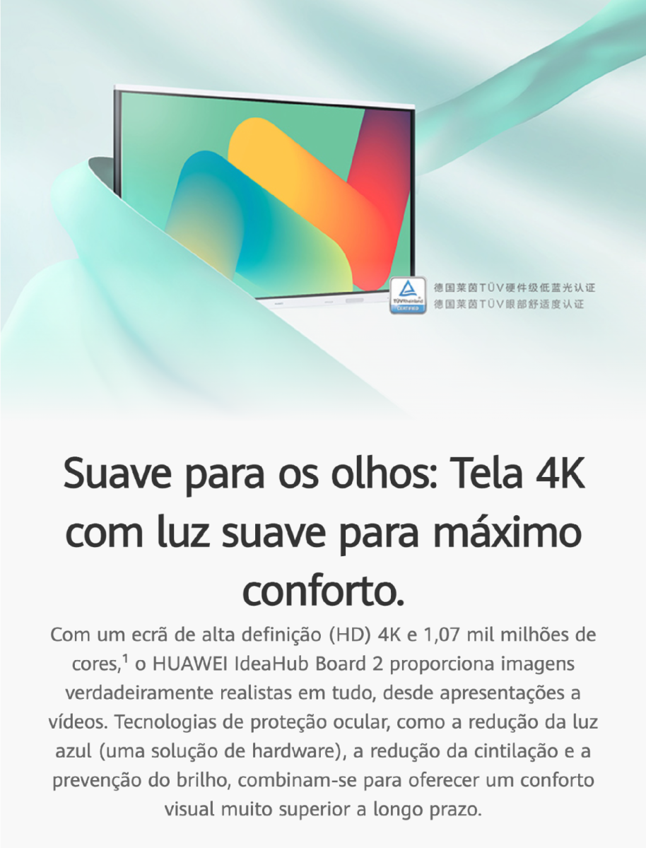 - Com um ecrã de alta definição (HD) 4K e 1,07 mil milhões de cores, o HUAWEI IdeaHub Board 2 proporciona imagens verdadeiramente realistas.