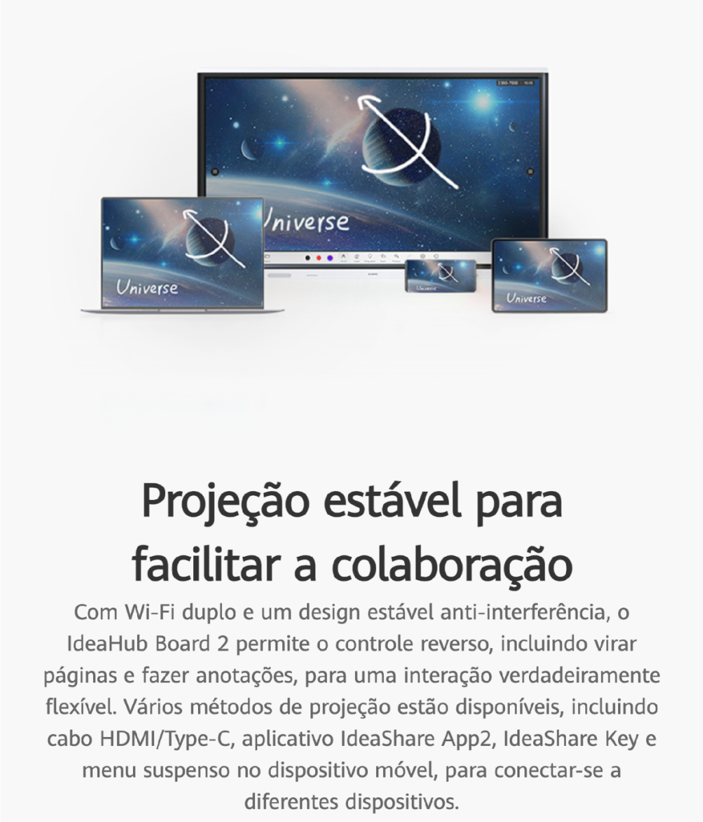 - Conectividade: **WiFi** duplo, suportando projeção sem fio, IdeaShare Key e conexão com fio (HDMI/Type-C).