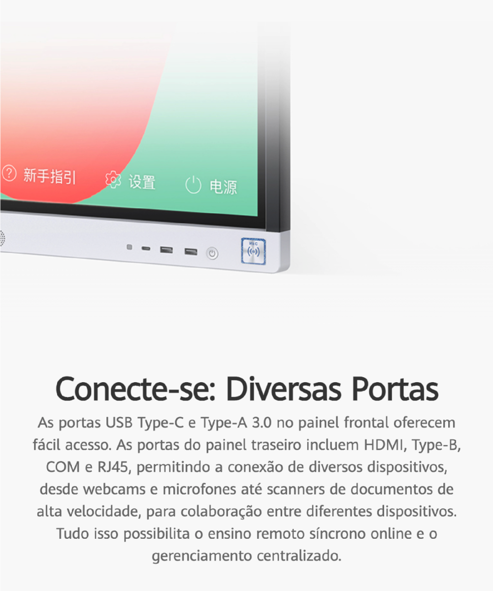 Leve o digital para todas as salas de aula para um ensino interativo e uma aprendizagem imersiva. Este dispositivo oferece uma experiência visual suave com sua **Tela 4K com luz suave para máximo conforto**. Com a filosofia de abertura e compatibilidade, o IdeaHub Board 2 permite que os educadores se concentrem no envolvimento dos alunos, eliminando barreiras tecnológicas. Possui múltiplos métodos de projeção e diversas portas para suportar o ensino remoto síncrono e o gerenciamento centralizado.