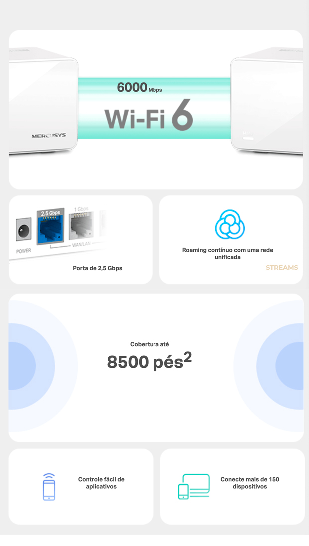Cobertura para toda a casa. Cobertura de até 6.000 pés² (550 m²) com WiFi de alta velocidade, eliminando zonas mortas de WiFi em sua casa.