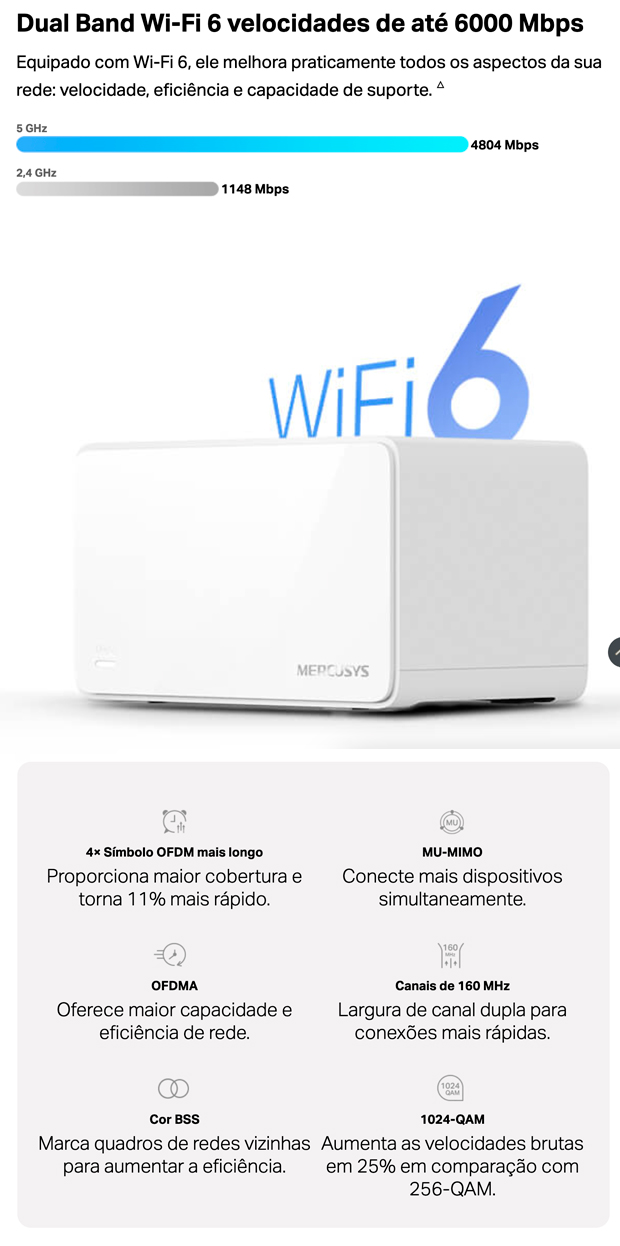 WiFi 6 de banda dupla com velocidades de até 6.000 Mbps 4.804 Mbps em 5 GHz e 1.148 Mbps em 2,4 GHz.