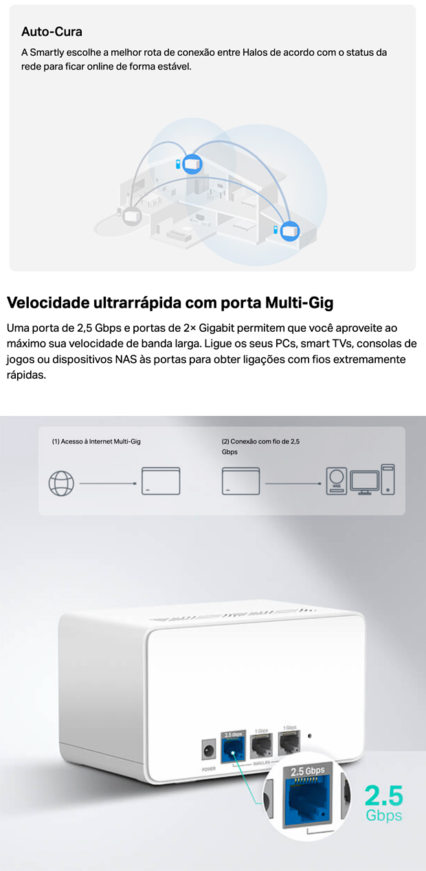 Portas Multi-Gig de 2,5 Gbps 1× 2,5 Gpbs e 2× portas Gigabit por unidade Halo para conexões com fio ultrarrápidas.
