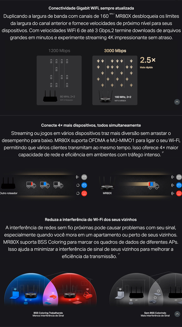 MAIS DISPOSITIVOS, MAIS DIVERSÃO : Suporta MU-MIMO e OFDMA para reduzir o congestionamento e quadruplicar a taxa de transferência média.