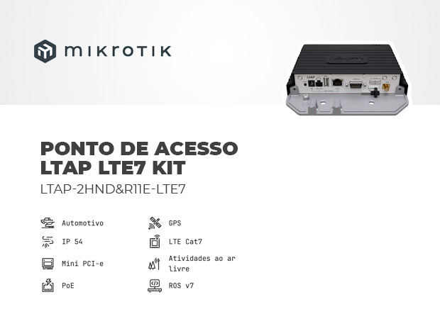 O novo kit LTE7 do LtAP leva tudo o que as pessoas amam no LtAP – o gabinete resistente à prova de intempéries, GPS embutido, extrema flexibilidade de energia e opções de expansão miniPCI-e... e adiciona nosso modem LTE Categoria 7 mais recente para uma grande melhoria no mundo real! Maior velocidade, estabilidade e taxa de transferência não são os únicos benefícios do novo modem. Ele vem com suporte a frequência expandida, incluindo a Banda 32 para melhor desempenho em áreas congestionadas e durante roaming. Mesmo formato confiável do LtAP – sem alterações na configuração do instalador. Apenas uploads mais rápidos, desempenho rural mais forte e um preço visivelmente melhor.