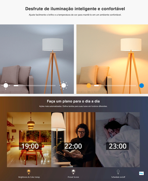 Programação ajustável/ação de cena: Não apenas acenda a luz a qualquer momento, mas também ajuste o brilho, a temperatura da cor e a cor na programação/cena.