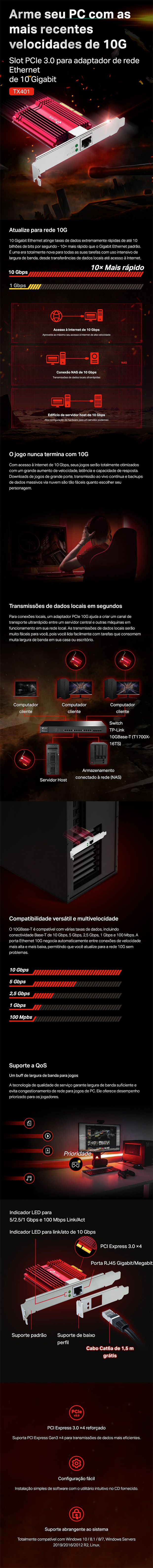 - Rede de 10 Gbps - Combinado com a mais recente tecnologia 10GBase-T, o TX401 oferece velocidades extremas de até 10 Gbps, que é 10× mais rápido que os adaptadores Gigabit típicos, garantindo transmissões de dados suaves para acesso à Internet e transmissões de dados locais.