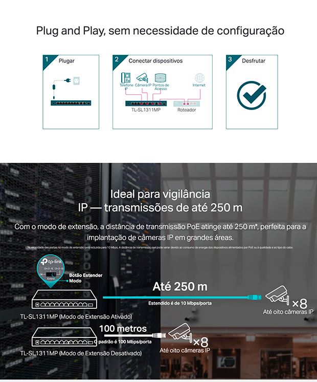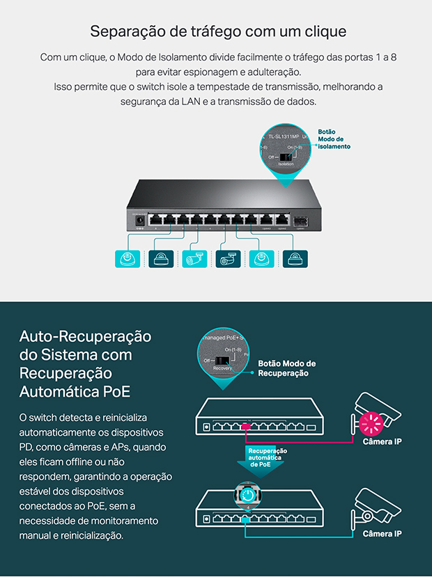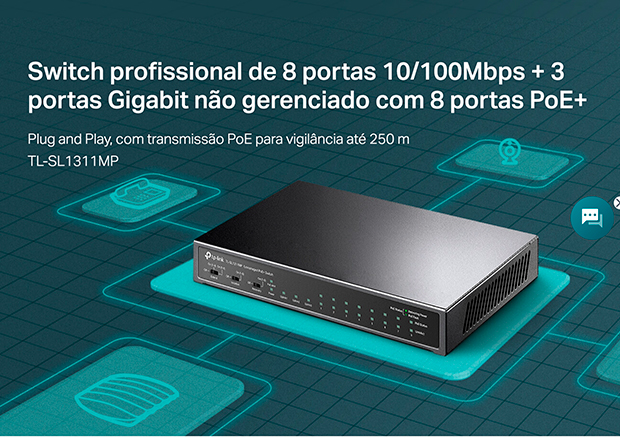 - 8× portas PoE+ transferem dados e alimentam cabos individuais