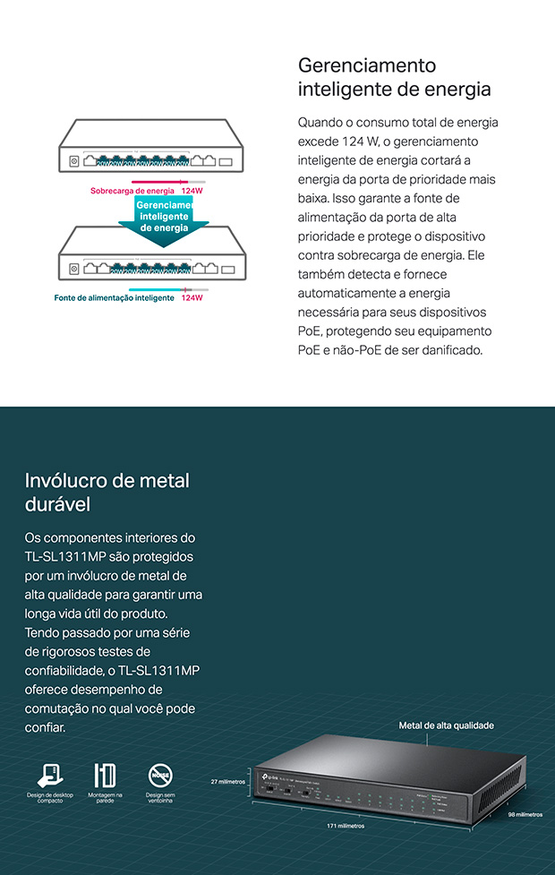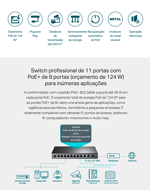 - Suporta PoE Power até 124 W para 8 portas PoE*
