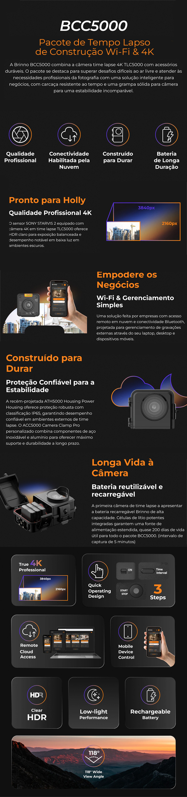 O BCC5000 é o pacote de construção mais avançado da Brinno, combinando a altíssima resolução 4K (UHD) com conectividade inteligente. Equipado com o sensor Sony STARVIS 2, este kit é focado em produtividade profissional, permitindo o gerenciamento remoto de grandes projetos através da nuvem e dispositivos móveis.