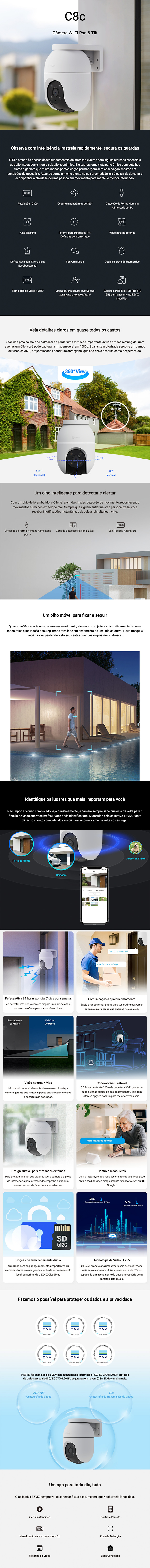 A EZVIZ C8c é uma câmera de segurança inteligente projetada para oferecer uma cobertura visual de 360° em ambientes externos. Combinando um design à prova de intempéries com recursos avançados de Inteligência Artificial, ela elimina pontos cegos e detecta movimentos humanos com precisão.