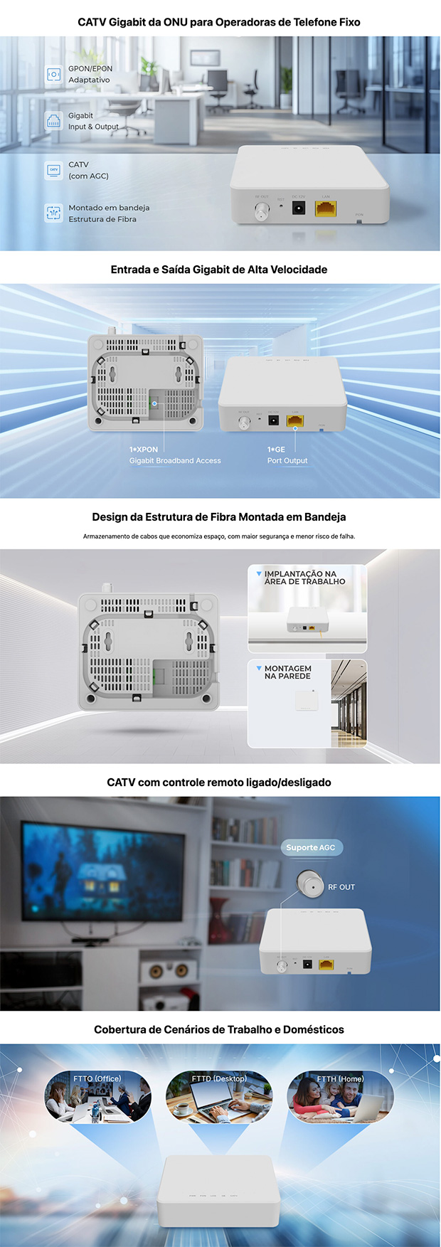 - Integração CATV: Possui uma porta RF dedicada para serviços de vídeo, suportando gerenciamento remoto para ligar ou desligar o sinal de TV.