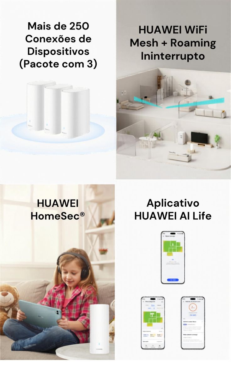 Suporta Huawei HarmonyLink e protocolo 802.11k/v/r, acesso à Internet PPPoE/DHCP/IP estático, detecção inteligente, inserção à cega de portas de rede, aplicativo HUAWEI AI Life para gerenciamento remoto, temporizador Wi-Fi, Wi-Fi para visitantes, proteção contra ataques de força bruta ao Wi-Fi, WPA3, controle dos pais, penetração VPN, DMZ/servidor virtual.