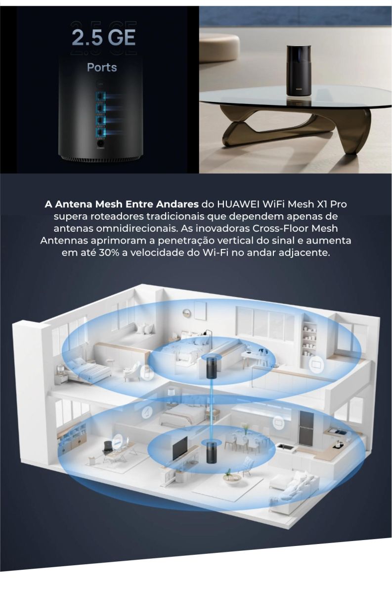 O HUAWEI WiFi Mesh X1 Pro supera os roteadores tradicionais que dependem exclusivamente de antenas omnidirecionais. A inovadora antena Cross-Floor Mesh melhora a penetração vertical do sinal e aumenta em até 30% as velocidades de Wi-Fi no andar adjacente.