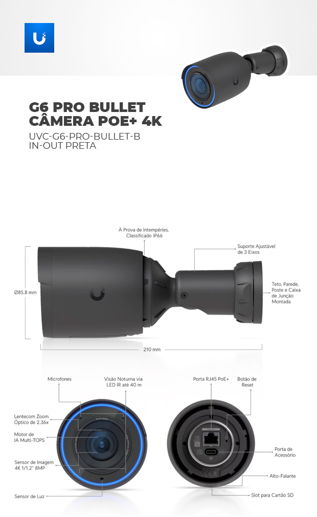 Modelo: UI. UVC-G6-PRO-BULLET-B UNIFI CAMERA 4K POE+ IN-OUT PRETA