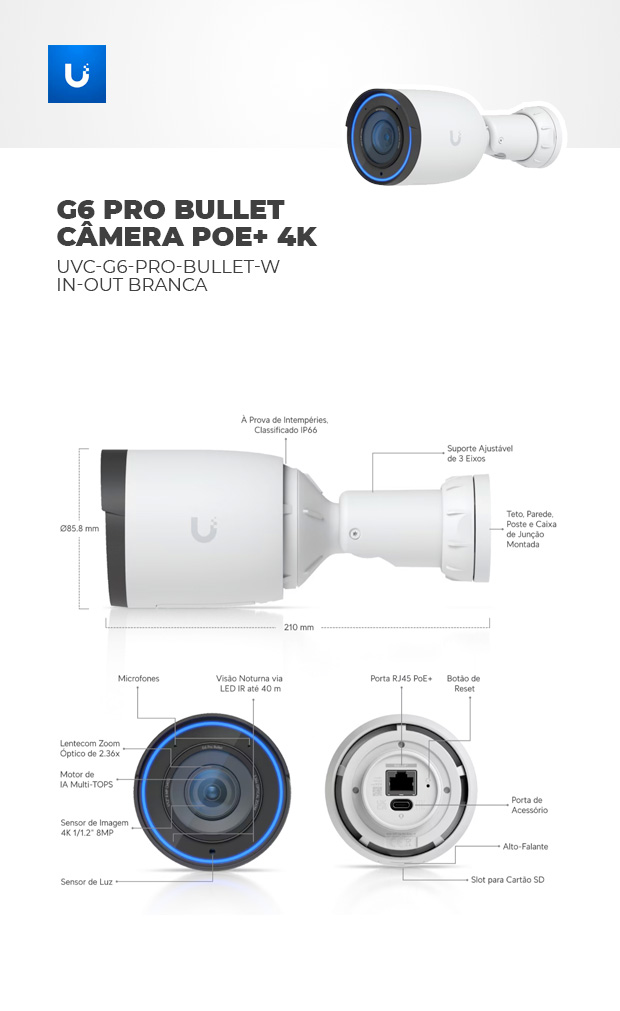 Modelo: UI. UVC-G6-PRO-BULLET-W UNIFI CAMERA 4K POE+ IN-OUT BRANCA